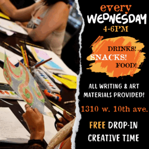 Stop in any Wednesday at 4 pm to engage in some writing and art prompts! We’re at 1310 West 10th Ave right next to the 10th and Osage light rail station.